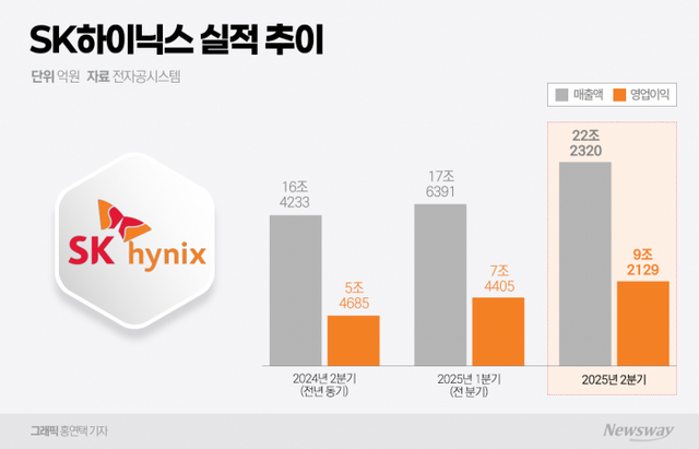 SK하이닉스는 올해 2분기 연결기준 매출 22조2320억원, 영업이익 9조2129억원을 기록했다고 24일 밝혔다. 전년 동기 대비 매출은 35.4%, 영업이익은 68% 늘었다. 이는 지난해 4분기에 달성한 기존 분기 최대 영업이익 8조828억원을 뛰어넘는 수치다. 매출 역시 사상 최대 분기 기록을 세웠다.