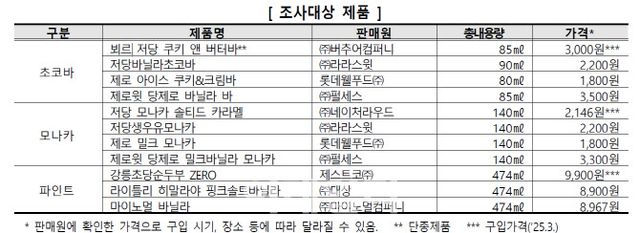 조사 대상 제품의 열량은 57~201㎉로 하루 에너지 필요 추정량의 3~10% 수준이었다. 모나카(127~161㎉)와 파인트(57~111㎉) 제품은 일반 아이스크림(190㎉)에 비해 열량이 낮은 편이었으나, 초코바 제품(149~201㎉)은 유사한 수준이었다.