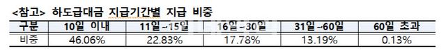 하도급대금 결제조건 공시를 보면 전체 집단의 약 94%(83개)는 법정지급 기간을 초과한 대금지급비율이 2% 미만에 불과했다. 10일 내 하도급대금을 지급한 비율은 평균 46.06%였고, 15일 이내 평균 68.89%, 30일 이내는 평균 86.68%로 집계됐다.