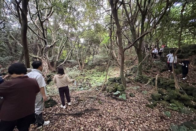 지난 22일 환경단체들이 기후대응 표준관측망 철탑이 설치될 예정이었던 수산곶자왈 일대를 답사하고 있다. 제주참여환경연대 제공