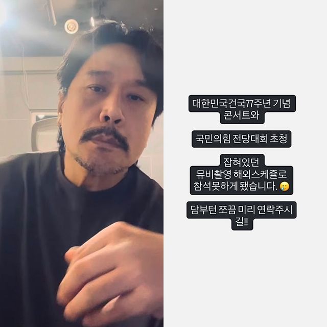 JK 김동욱은 24일 자신의 SNS를 통해 “대한민국 건국 77주년 기념 콘서트와 국민의힘 전당대회에 초대를 받았지만, 이미 오래전부터 잡혀 있던 뮤직비디오 촬영 등의 해외 일정으로 인해 참석하지 못하게 됐다”고 아쉬움을 전했다.