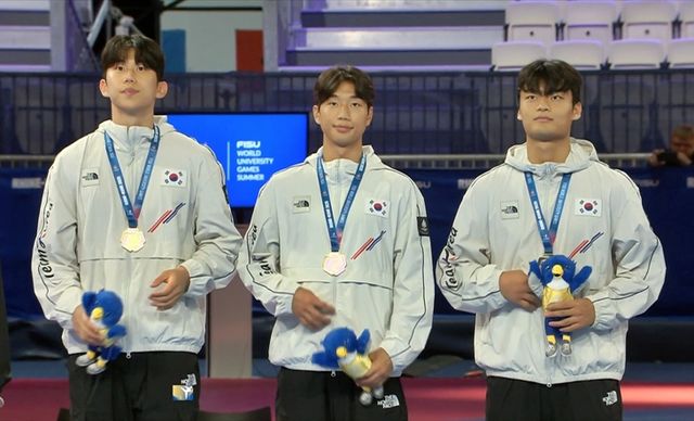 23일 끝난 2025세계대학경기대회 태권도 단체전에서 금메달을 따낸 대한민국 강상현, 김효혁, 서건우(왼쪽부터).