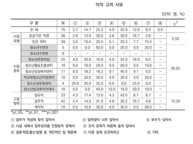 이직을 고려한 적이 있다는 응답자는 전체의 62.5%였다. 이직 고려 사유는 '조직 문화가 마음에 들지 않아서' 32.0%, '보수가 낮아서' 25.3%, '업무량이 너무 많아서' 14.7% 등 순이었다. 청소년수련관과 청소년방과후아카데미의 경우 '보수가 낮아서'의 응답이 평균보다 높았다.