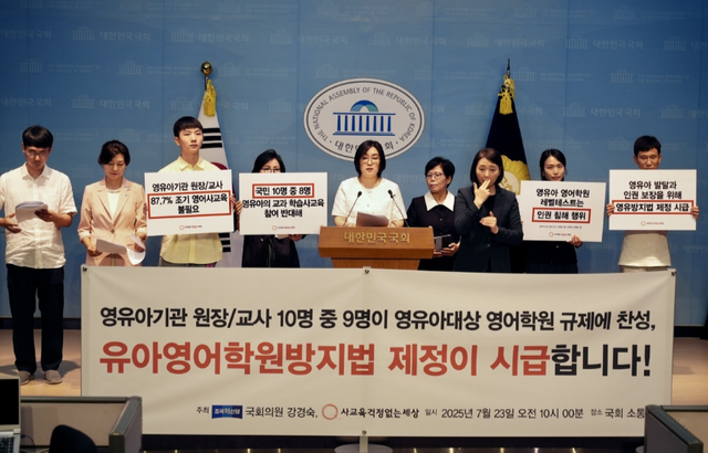 23일 조국혁신당 강경숙 의원은 서울 여의도 국회 소통관에서 기자회견을 열고 영어 사교육 규제를 위한 '영·유아 영어학원 방지법'(이하 영유금지법)을 대표 발의했다고 밝혔다. 새롭게 발의된 '영유금지법'은 ▲36개월 미만 유아 영어 교습 금지 ▲36개월 이상 미취학 아동 하루 40분 이내로 교습시간 제한 등의 강도 높은 제재를 담고 있다. 강 의원은 "영·유아의 발달 특성과 권리를 실질적으로 보호하고 무분별한 조기 사교육의 구조적 문제를 근본적으로 해결하기 위한 조치다"며 "영·유아도 사람이라는 기본적인 인권 인식에서 출발해 영유아 교육의 본질을 되찾을 시기다"고 강조했다.