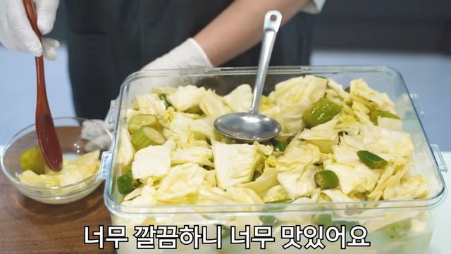 주요 재료는 양배추 1.3kg, 오이 4개(800g), 청양고추 10개, 마늘 10쪽이다. 양배추는 채소 세정제로 3분간 담가 세척한 후 먹기 좋은 크기로 자르고 천일염 2큰술로 1시간 정도 절인다.
