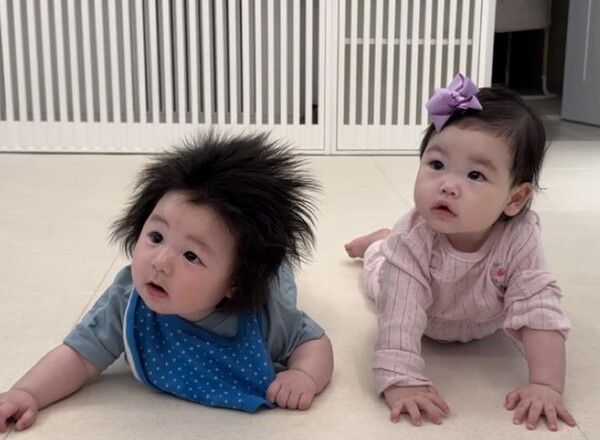 사진에는 박수홍·김다예 부부의 딸 재이 양과 심형탁·사야 부부의 아들 하루 군이 나란히 누워 있거나 소파에 앉아 교감을 나누는 모습이 담겼다.
