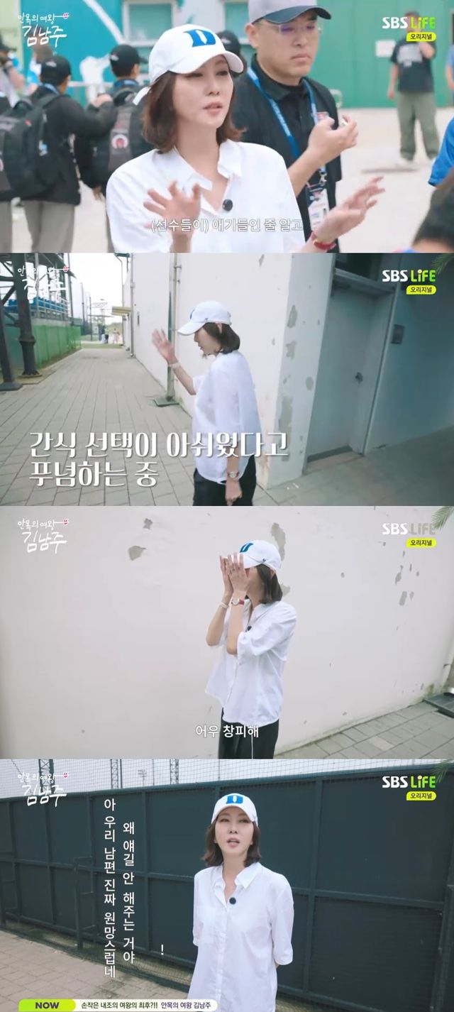 김남주는 남편 김승우가 이끄는 선수들을 위해 손수 간식을 만들어 나눠주는 등 내조에 나섰다. 김남주는 호두과자를 소분해 간식을 준비했는데, 생각보다 큰 덩치의 아이들에 몹시 당황했다.
