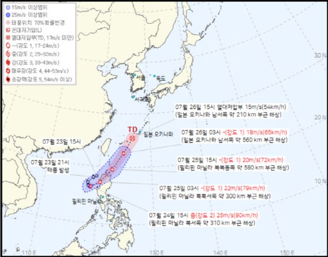 전날 오후 9시에 발생한 8호 태풍 ‘꼬마이’는 필리핀 북쪽을 지나 오는 26일쯤 일본 오키나와 남쪽 해상에서 열대저압부로 약화할 전망이다.
