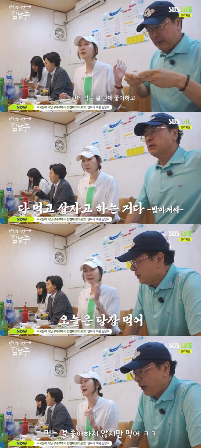 특히 김남주는 "'이 사람은 나한테 할 말이 '밥은' 밖에 없나?' 이런 적도 있다. 근데 먹는 거를 원체 좋아한다"라며 김승우의 남다른 먹성을 자랑했다.