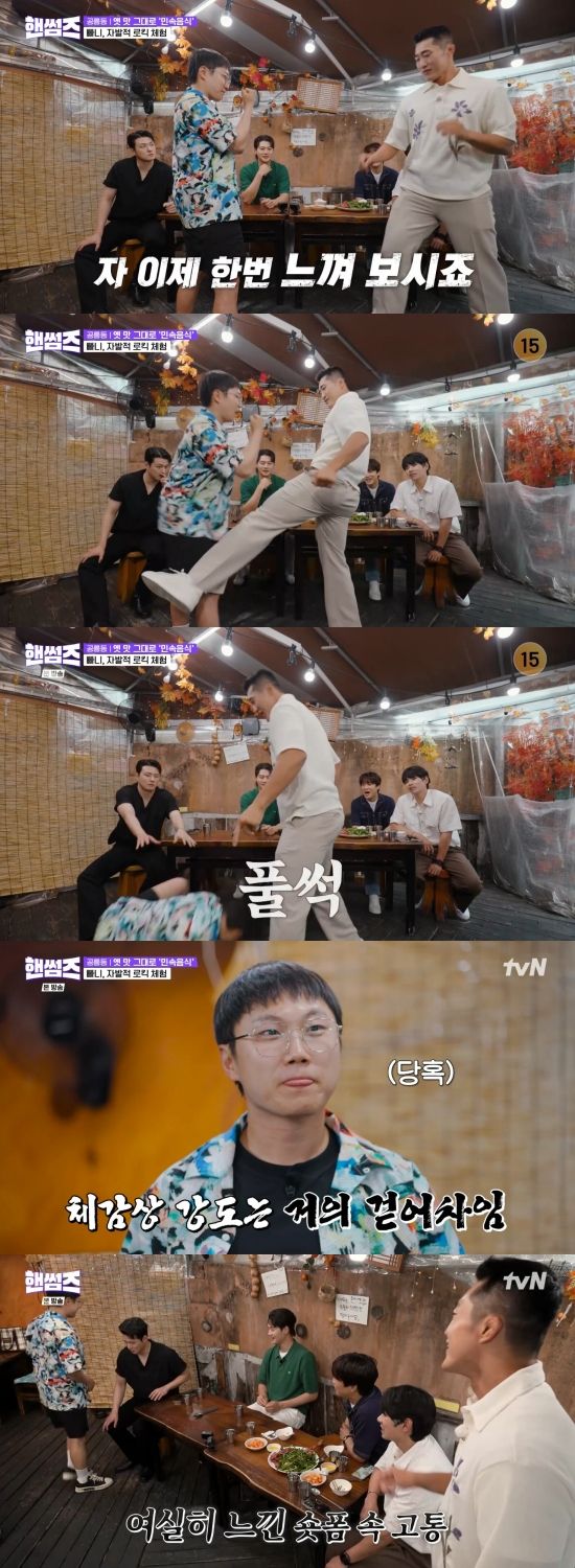 특히 김동현은 빠니보틀에게 로킥을 날렸고, 빠니보틀은 로킥을 맞자마자 쓰러졌다. 김동현은 "성훈 형은 여기서 묻는다. 나는 퉁 하고 끝났다. 이럴 때 반대쪽 맞으면 괜찮아진다"라며 너스레를 떨었고, 이이경은 "윽 소리도 안 나온다"라며 깜짝 놀랐다.