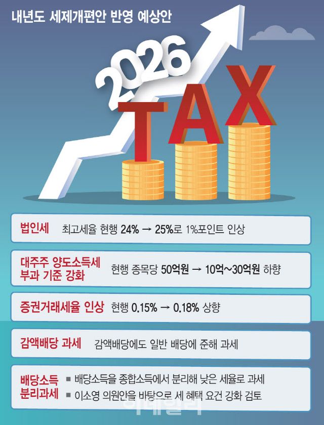 24일 국정기획위원회와 관가에 따르면 이르면 다음 주중 발표를 앞둔 ‘내년도 세제 개편안’에 법인세·대주주 양도소득세·증권거래세율 인상 등이 담길 전망이다. 윤석열 정부 당시 ‘부자 감세’를 전면 원상복구하는 방향으로 가닥을 잡은 분위기다. 이외 그동안 이익 분배가 아닌 출자금의 회수로 여겨져 배당금 전액을 비과세했던 감액배당에 대해서도 과세할 방침이다. 배당소득 분리과세는 ‘부자 감세’ 논란 등으로 당정이 막판 고심 중으로 알려졌다.