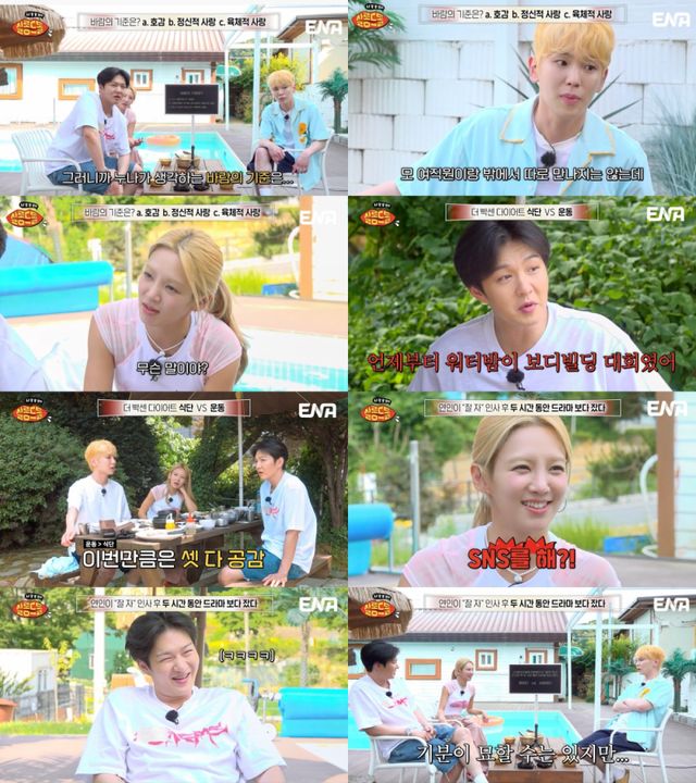 이외에도 ‘필름이 끊긴 다음 날 더 최악인 것은? 회사 대표님 vs 전 연인’, ‘전 연인이 주변에 한 말 중 더 열받는 것은? 걔 쓰레기였어 vs 나 걔랑 안 사귐’ 등 난이도 극악의 선택지가 등장하며 치열한 토론을 부른다. 세 사람은 같은 아이돌 출신으로서 공감대를 나누다가도 쉴 틈 없는 토론 배틀을 펼치며 첫 방송부터 공감 가득한 웃음을 전할 예정이다.