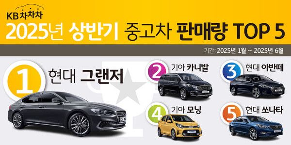 뉴시스 보도에 따르면, 25일 KB캐피탈 중고차 거래 플랫폼 KB차차차가 2025년 상반기 중고차 판매량을 분석한 결과 판매량 1위는 현대 그랜저가 차지했다.
