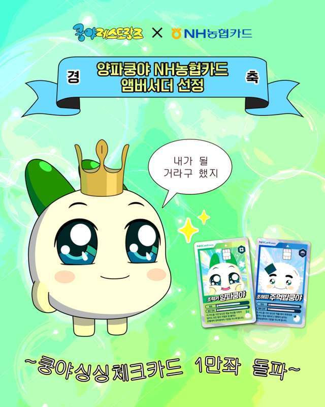 NH농협카드는 '쿵야싱싱체크카드'가 출시 한달 만에 신규 발급좌수 1만좌를 돌파했으며 '양파쿵야' 캐릭터가 NH농협카드 앰버서더로 선정됐다고 25일 밝혔다.