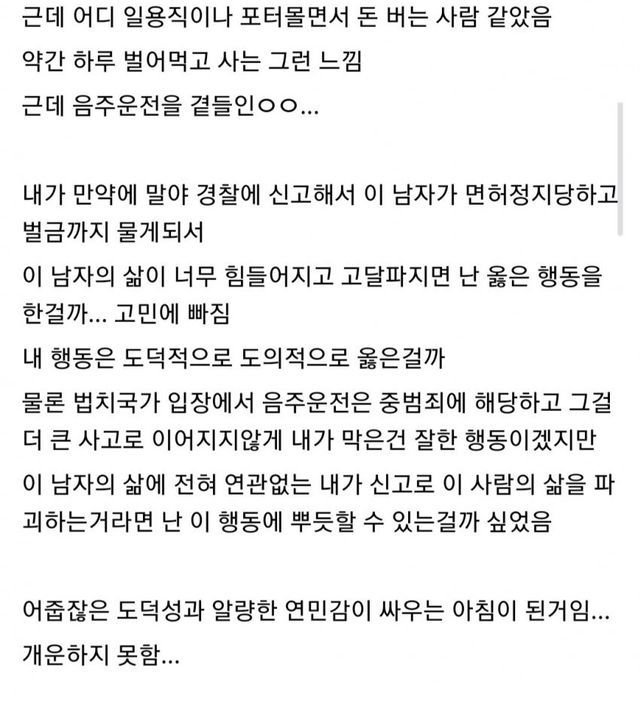 주취자의 음주운전에 살해당할 잠재적이고 불특정한 피해자를 미연에 구하기 위하여 신고한다