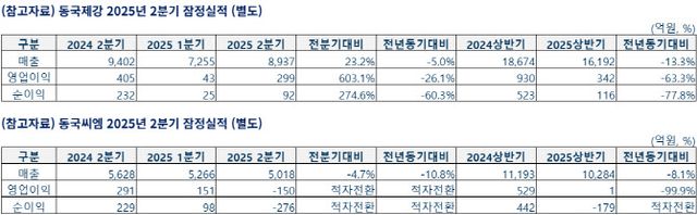 동국씨엠은 2분기 K-IFRS 별도 기준 매출 5018억원, 영업적자 150억원, 순손실 276억원을 기록했다. 지난해 같은 기간과 비교해 매출은 10.8% 감소, 영업이익과 순이익 모두 적자 전환했다.