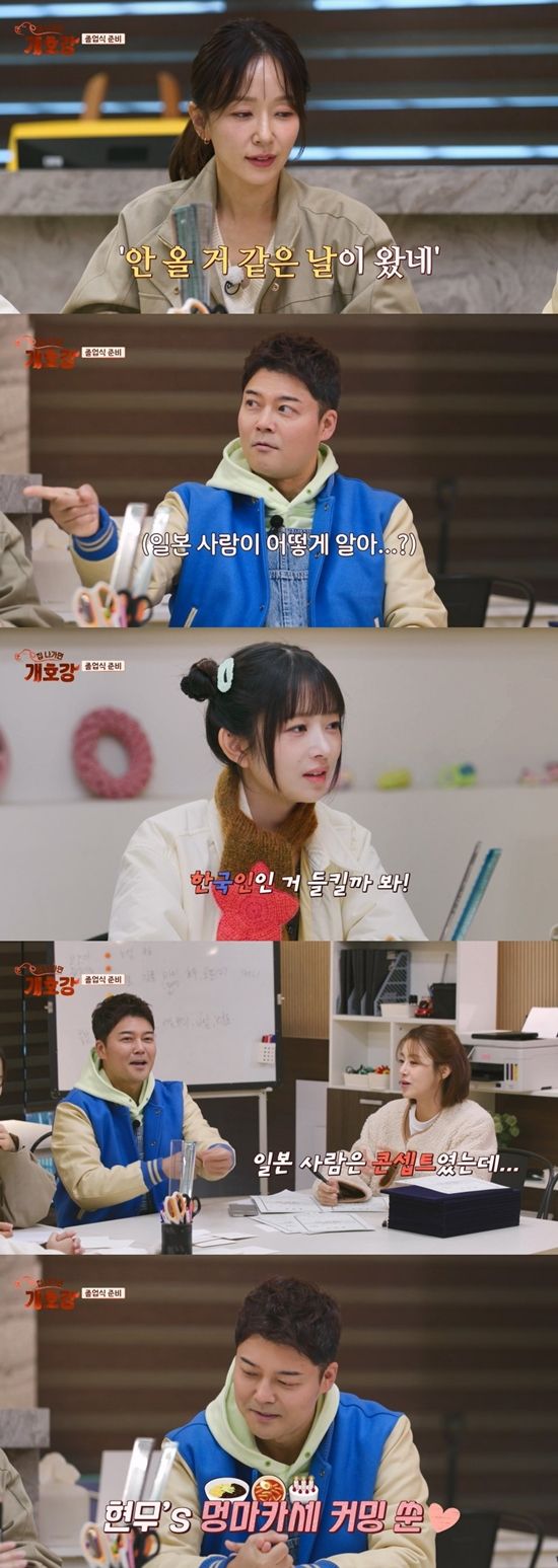 27일 방송되는 JTBC '집 나가면 개호강'에서는 '개호강 유치원'의 졸업식이 열린다. 졸업식을 앞두고 전현무를 비롯해 강소라, 조한선, 박선영, 레이 등 모든 선생님이 한자리에 모인다. 박선영은 "안 올 거 같은 날이 왔다"라며 마지막 날을 믿기 어려워한다. 강소라는 졸업장을 준비하며 마지막 날을 대비한다.