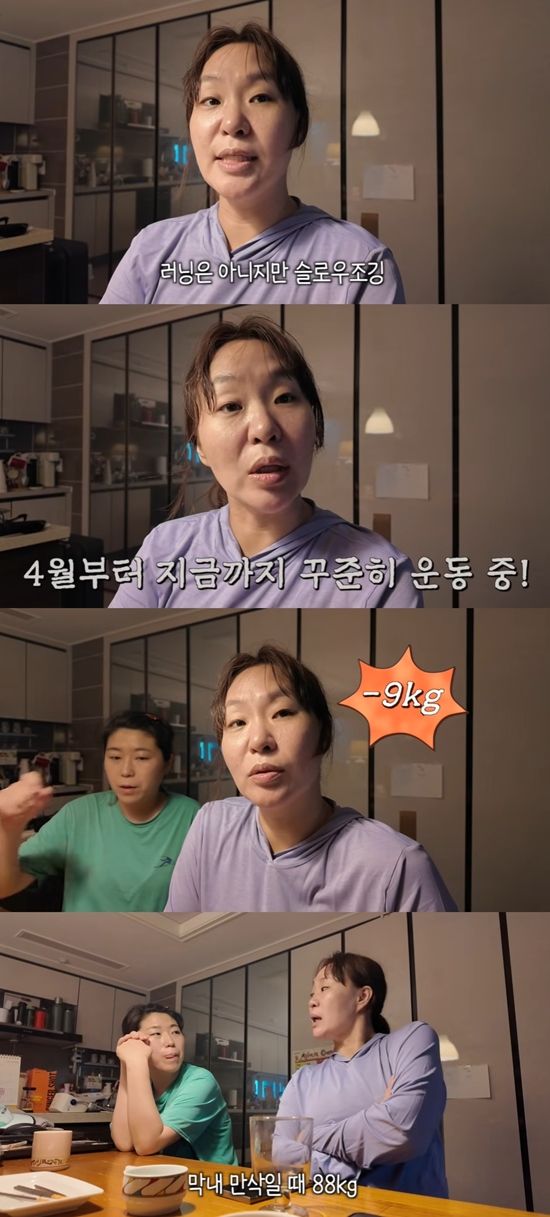 이어 그는 "4월부터 슬로우조깅으로 운동을 했다. 일주일에 3~4번씩 두 달 됐다. 나 전보다 9kg 빠졌다"라며 체중 감량 소식을 전했다. 또 "막내 만삭일 때 88kg까지 나갔다. 내가 딱 막내를 낳고, 몸무게가 84kg이었다"라고 덧붙였다.