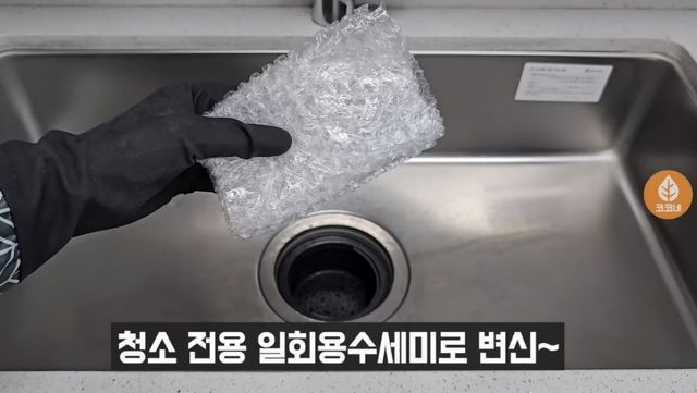 하지만 가장 주목할 만한 활용법은 바로 싱크대 청소용 일회용 수세미로 사용하는 것이다. 기존 청소용 수세미는 아무리 관리해도 세균이 남아있을 수 있다는 우려가 있었지만 뽁뽁이를 적당한 크기로 잘라서 수세미로 사용하면 이런 걱정을 덜 수 있다.