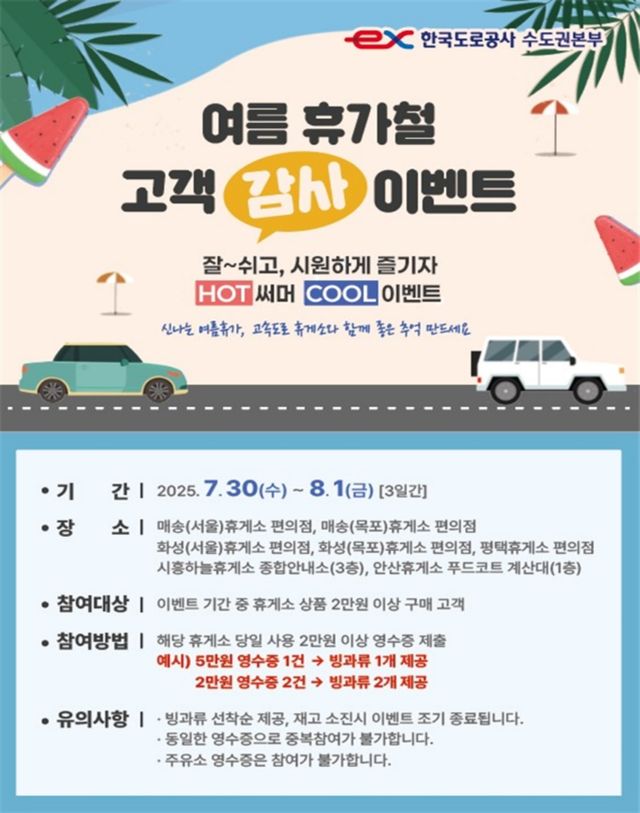 한국도로공사 수도권본부가 여름 휴가철을 맞아 수도권 서부 고속도로 휴게소 7곳에서 고객 감사 행사를 진행한다고 25일 밝혔다.