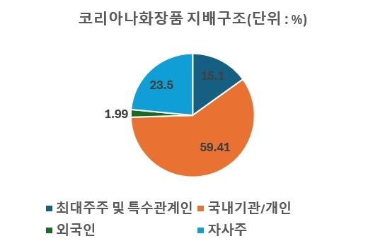 이번에 처분하는 자사주는 발행주식 총수의 5%에 해당된다. 코리아나화장품은 올 1분기 말 기준 24.5%의 자사주를 보유하고 있다. 최대주주 및 특수관계인이 보유한 지분(14.97%) 보다 10% 가량 많다. 최대주주인 유학수 대표는 5.2%의 지분을 갖고 있다.