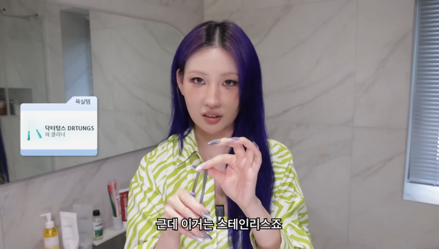 현재 보라색 탈색머리를 유지하고 있는 이사배. 탈색하기 전에는 두피 케어에 집중했다면, 탈색 이후로 머리카락 케어에 더 열심이라는데! 그 이유가 두피 관련 제품을 쓰니, 컬러가 너무 금방 빠지게 되고 머릿결은 더욱 안 좋아졌다는 얘기다. 그래서 대안으로 선택한 것이 샴푸는 두피 케어를, 트리트먼트는 염색모를 위한 관리로 밸런스를 나누며 관리 중이라고.