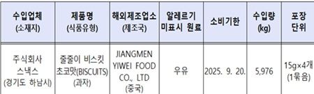 식품의약품안전처(처장 오유경)는 ‘주식회사 스낵스(경기도 하남시 소재)’가 수입∙판매한 ‘줄줄이 비스킷 초코맛(식품유형: 과자)’에 알레르기 유발물질 표시 대상인 ‘우유’가 표시되지 않은 것이 확인되어, 판매 중단하고 회수 조치한다고 밝혔다.