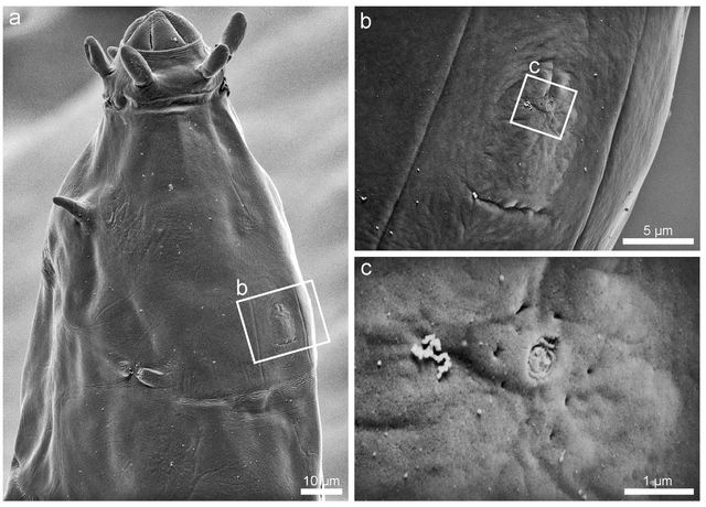 신종 물곰의 감각기관 모습. 극지연구소 연구진은 전자현미경 관찰을 통해 해당 신종 물곰의 머리 중앙에 약 1㎛(마이크로미터=100만분의 1m) 크기의 미세한 감각기관이 있음을 확인했다. 이와 관련해 극지연구소 연구진 "이 감각기관은 지금까지 완보동물에서 보고된 적이 없으며 형태와 위치가 새우나 고생대 삼엽충 화석에서 나타나는 감각기관과 매우 유사하다"라며 "이는 완보동물과 절지동물 사이 진화적 연결고리를 밝히는 단서를 제공할 수 있다"라고 설명했다. / 극지연구소 제공