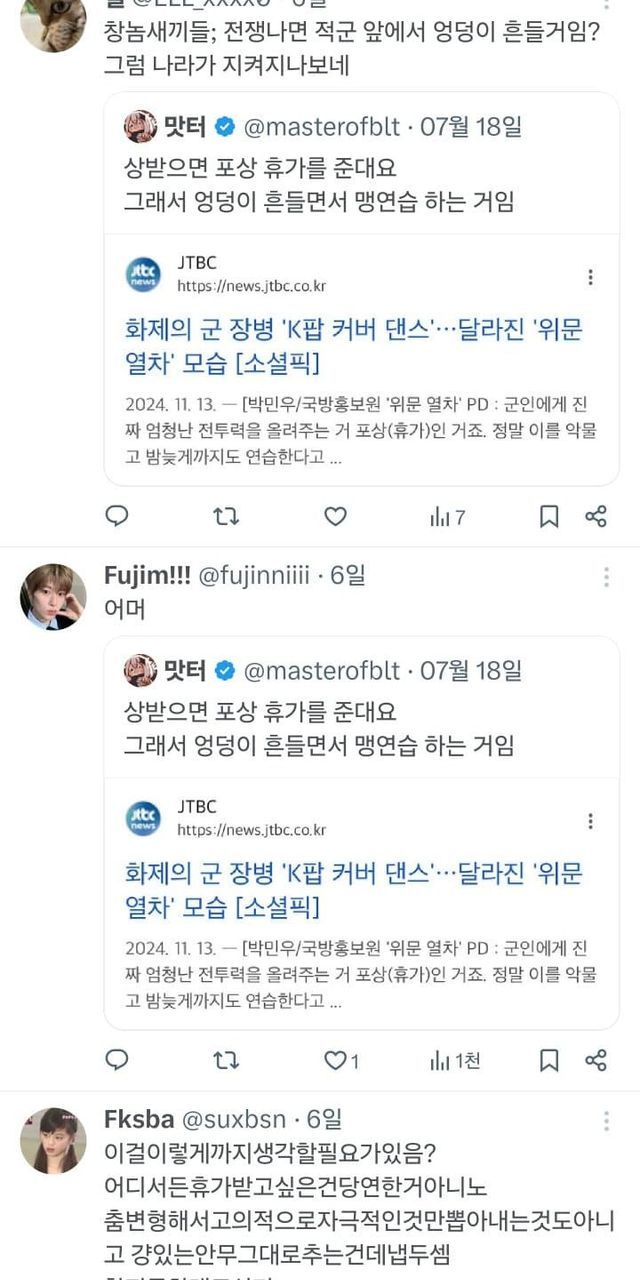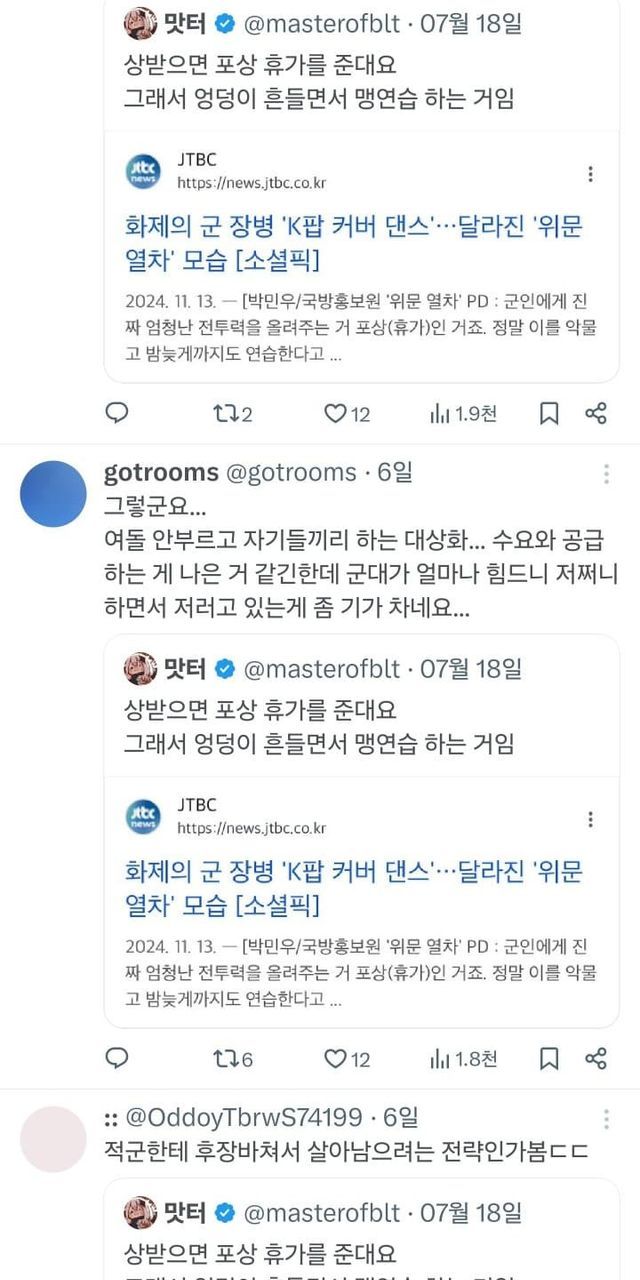 "남자들 전쟁나면 맨날 여자들 성노리개 된다더니 진짜 성노리개는 지들이었고ㅋㅋ"