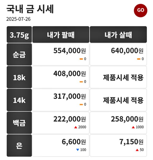 순금(24K) : 매입가 64만 5000원 / 매도가 54만 7000원