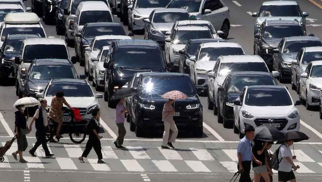 대구 중구 달구벌대로에서 양산을 쓴 시민들이 아지랑이가 피어오르는 도로를 건너고 있다. / 뉴스1