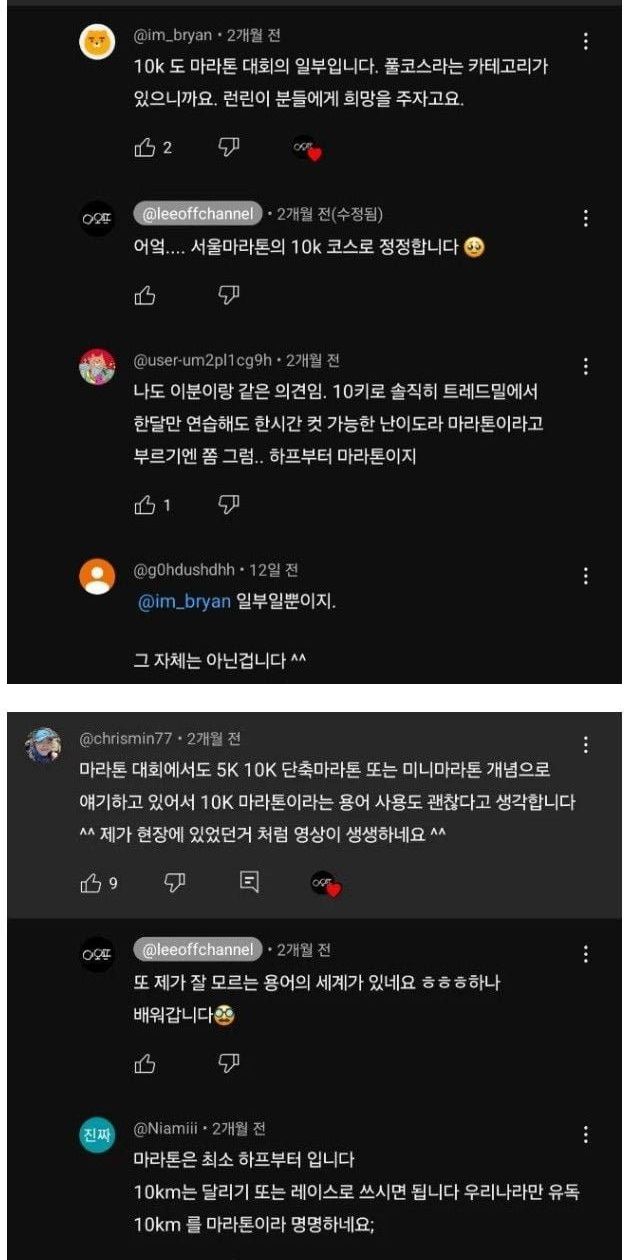 10km 코스에는 마라톤이라는 명칭 붙이면 안된다 지적받음 그 안에서도 42.195km 풀코스만 마라톤이다 최소 하프부터 마라톤이다 갈림