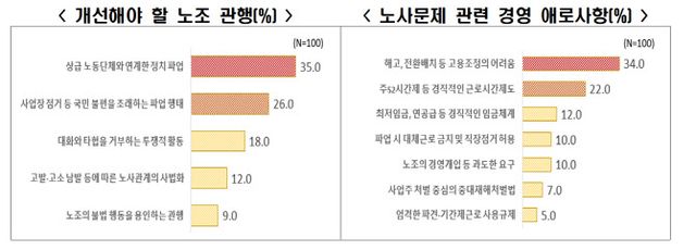 노사문제와 관련해서는 경직적인 제도를 어려운 점으로 꼽았다. 해고나 배치전환 등 고용 조정의 어려움에 대해 애로를 느낀다는 기업이 34%로 가장 많았다. 이어 주 52시간제 등 경직적인 근로시간제도(22%), 최저임금과 연공급 등 경직적인 임금체계(12%) 등을 지목했다.