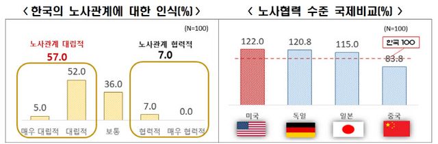 외투기업 중 과반 이상인 57%는 한국의 노사관계가 대립적이라고 생각한다고 응답했다. ‘매우 대립적’이라는 응답이 5%, ‘대립적’이라는 답이 52%였다. 노사관계가 협력적이라고 생각한다는 기업은 7%에 불과했다.