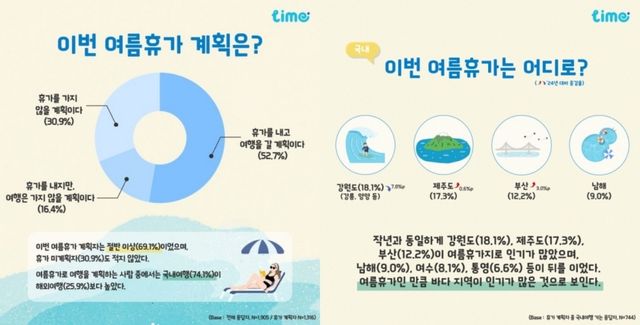 휴가지로 국내를 고른 이들도 눈에 띄게 많아졌다. 휴가 계획자 가운데 국내 여행을 선택한 응답자는 74.1%로 지난해보다 5.2%포인트 늘었다. 반면 해외여행을 택한 응답자는 25.9%로 전년 대비 5.2%포인트 감소했다.