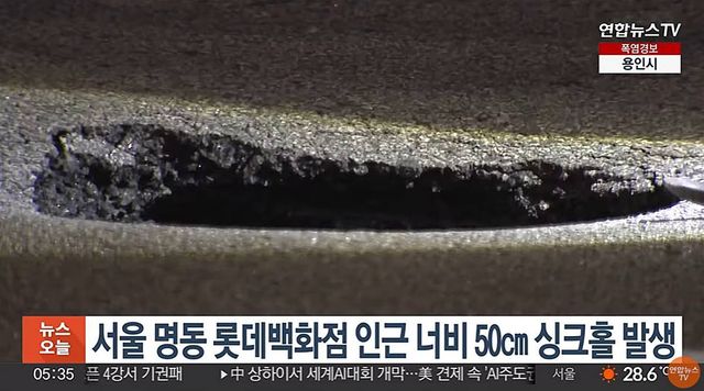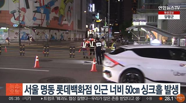 서울 명동 롯데백화점 인근 너비 50㎝ 싱크홀 발생. 현장 사진 / 연합뉴스TV