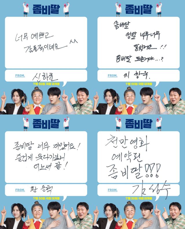 이어 지창욱은 “‘좀비딸’ 정말 너무 너무 좋았다. ‘좀비딸’ 도른거야”라는 유쾌한 찬사를 보냈고, 정은지는 “이렇게 사랑스러운 좀비는 처음”이라는 말로 영화에 대한 기대감을 높였다.