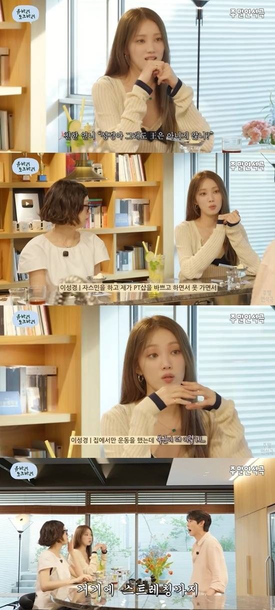 이에 이성경은 자스민 역으로 출연한 뮤지컬 '알라딘'을 언급하며 "의상 노출이 있다 보니 실제로 리허설할 때는 초반에 배에 왕(王)자가 있었다"고 얘기했다.