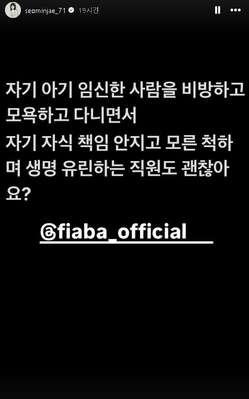 현재 서민재는 오는 12월 13일 출산을 앞두고 있으며, SNS를 통해 임신 사실부터 그간의 상황을 상세히 공유해왔다. 그가 공개한 내용에는 A씨의 실명, 직장, 가족 신상까지 포함돼 파장이 커졌다.