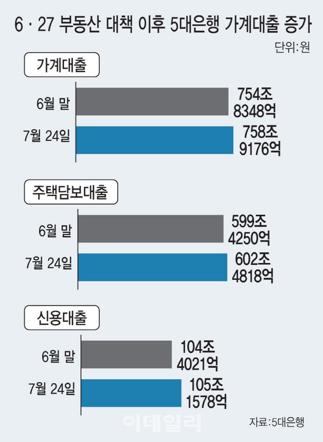 27일 금융권에 따르면 KB국민·신한·하나·우리·NH농협 등 5대 은행의 지난 24일 기준 가계대출 잔액은 758조 9176억원으로 집계됐다. 6월 말보다 4조 828억원 늘었다. 그러나 현재 증가 속도라면 이달 증가액은 5조원 초반대로 6월 증가폭(6조 7536억원)의 70% 수준에 머물 것으로 보인다. 하루평균 증가액(1701억원)이 6월(2251억원)보다 24% 작다. 작년 7월 5대 은행의 가계대출 증가액은 7조 1660억원이었다. 주택담보대출(주담대)도 24일까지 3조 568억원 늘어 이달 증가액이 6월 증가 폭(5조 7634억원)에 못 미칠 것으로 추산된다. 신용대출 역시 7557억원 늘어나 전달 증가 폭(1조 876억원)보다 줄어들 전망이다.