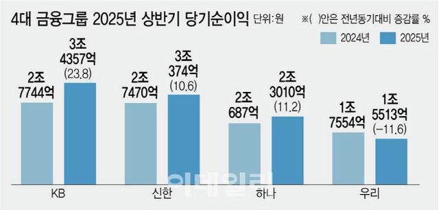 27일 금융권에 따르면 4대 금융그룹(KB·신한·하나·우리)의 올 상반기 당기순이익은 총 10조 3254억원으로 1년 전보다 10.5% 증가했다. KB금융그룹의 당기순이익이 23.8% 증가한 3조 4357억원으로 ‘리딩금융그룹’ 위상을 굳건히 했다. 신한금융이 10.6% 증가한 3조 374억원을 기록해 KB와 신한금융의 올해 6조원 클럽 가능성도 조심스레 점쳐진다. 하나금융이 2조 3010억원으로 전년대비 11.2% 증가해 상반기 기준 최고 실적을 기록했다. 4대 금융 중에서는 우리금융 실적만 뒷걸음질쳐 지난해 같은 기간보다 11.6% 감소한 1조 5513억원의 당기순이익을 냈다.