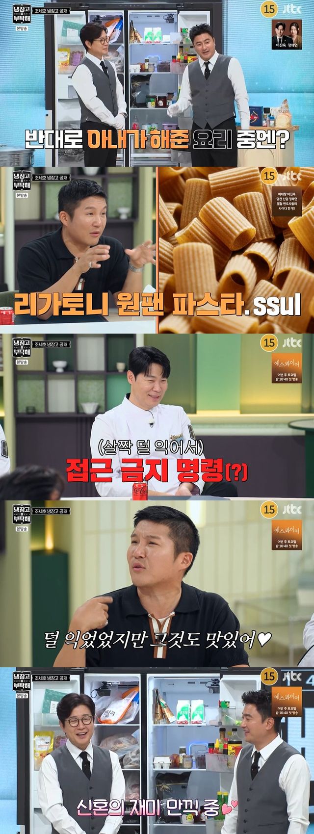 이에 조세호는 "좀 귀여웠던 게, 리가토니 면 원팬 파스타를 준비해 줬는데 먹더니 부엌에 오지 말라더라. 덜 익었었는데 그 자체도 맛있었던 기억"이라며 아내를 향한 애정을 뽐냈고, 김풍이 "딱딱해서 이가 나가도 맛있는 거다"라고 하자 "이가 문제냐. 임플란트가 이렇게 잘되어 있는데"라며 너스레를 떨었다.