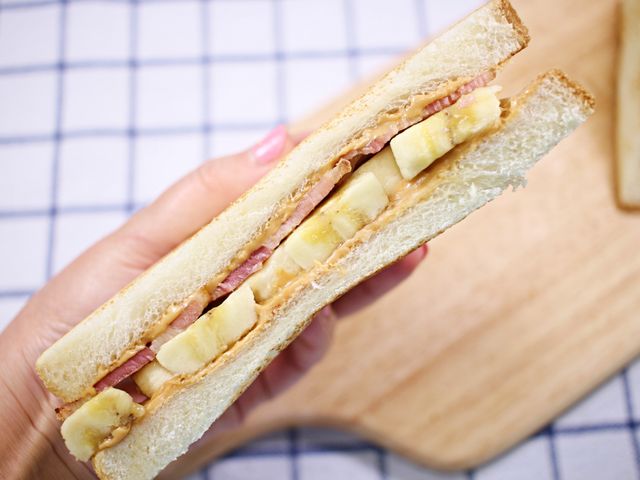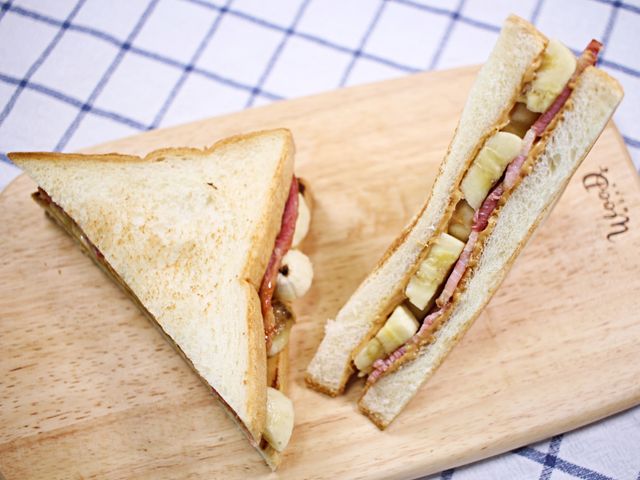 재료는 식빵, 바나나, 베이컨, 땅콩버터.