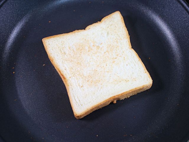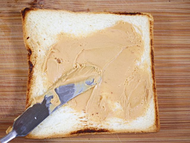 구운 식빵 한쪽 면에 땅콩버터를 골고루 펴발라 주세요.