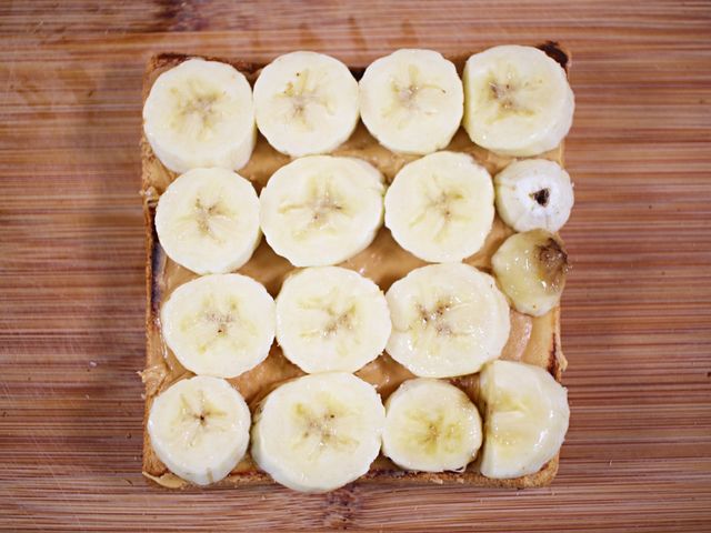 땅콩버터 위에 바나나 슬라이스를 빈틈없이 올리고