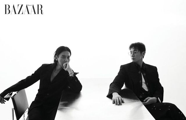 김남길이 착용한 재킷, 팬츠는 Ferragamo. 목걸이, 팔찌는 Cartier. 김영광이 착용한 블레이저, 셔츠는 Amiri. 슬리브리스 톱은 Recto. 팬츠는 Stu. 안경은 Gentle Monster. 반지, 팔찌는 Numbering.