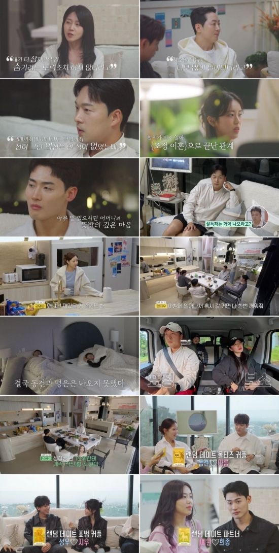 어색함과 설렘 속, 조깅을 마치고 돌아온 이들은 동건이 차린 아침 식사를 먹으면서 대화를 나눴다. 이때 도형-인형은 “마음 속 1순위에게 계속 직진할 것”이라는 속내를 공유해 명은을 사이에 둔 삼각 로맨스 전쟁을 예감케 했다. 아침 식사가 끝나자 “돌싱녀들이 마음에 드는 ‘동물 키워드’를 선택해 매칭되는 ‘랜덤 데이트’가 있다”는 공지가 전달됐다. 여기서 수하가 솔직한 골든 리트리버, 지우는 열정적인 표범, 아름은 마초 같은 몰티즈, 예원은 긍정적인 백마를 선택했고, ‘첫인상 올킬녀’ 명은은 가장 늦게 나타나 마지막 남은 ‘건실한 수달’을 픽했다. 이를 지켜보던 5MC는 “명은이가 애간장 태우는 스타일이네~”라며 입을 모았다. 직후, 매칭 결과가 공개됐는데, 명은X도형, 아름X동건, 지우X성우, 예원X희종, 수하X인형이 ‘랜덤 데이트’를 하게 됐다. 이중 지우X성우는 서로를 ‘첫인상 1순위’로 택한 데다, 조식 데이트는 물론 ‘랜덤 데이트’까지 연결돼 “운명이야?”라는 5MC의 환호를 받았다.