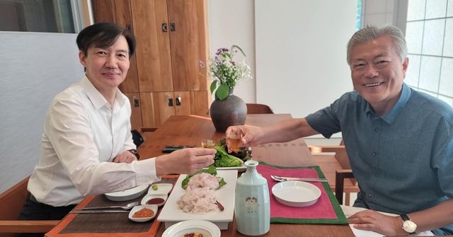 조국 전 법무부 장관이 2023년 6월 10일 경남 양산시 평산책방을 찾아 책방지기로 봉사한 뒤 문재인 전 대통령과 회를 안주로 건배하는 사진. 최동석 인사혁신처장이 SNS에 올린 사진이 이것인지는 확실치 않다. / 조국 전 장관 페이스북 캡처