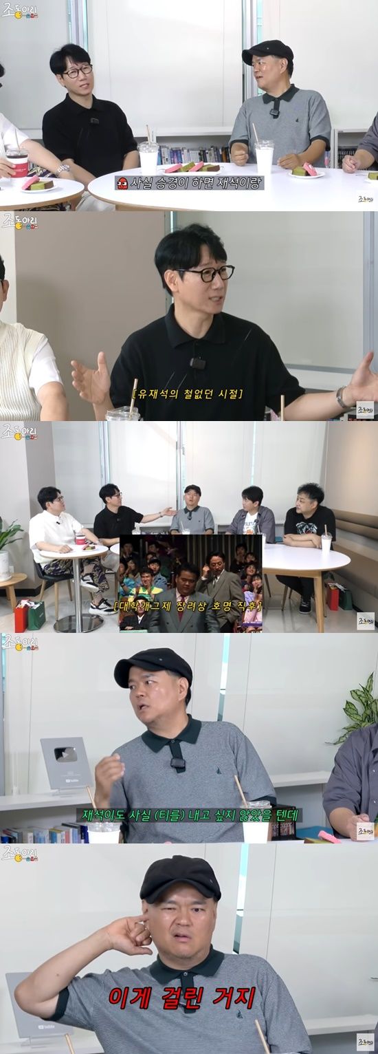 공개된 영상에서 지석진은 "승경이 하면 재석이의 전설의 짤이 있지 않냐. (유재석이) 장려상에 귀 후비면서 나온 거"라며 "그 때 같이 상 받지 않았냐. 너도 기분 나빴냐"고 물었다.