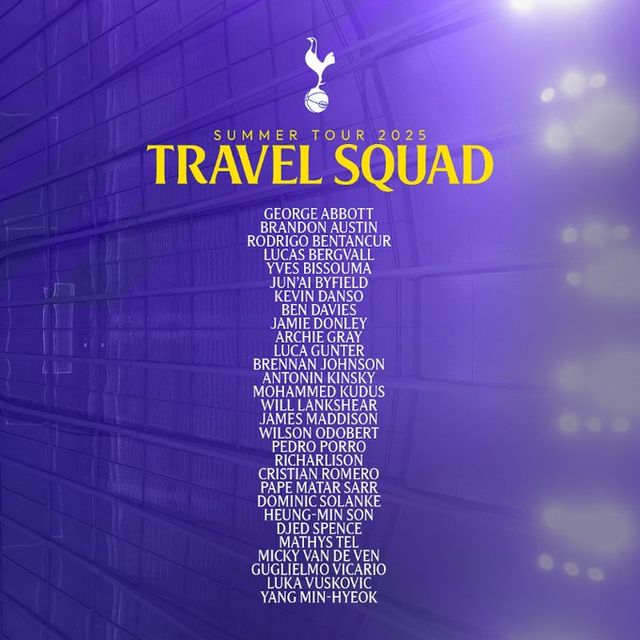 총 29명의 투어 명단에는 주축 선수 다수가 포함됐다. 손흥민, 크리스티안 로메로, 제임스 매디슨, 페드로 포로, 브레넌 존슨, 도미니크 솔란케, 로드리고 벤탄쿠르, 이브 비수마, 파페 사르, 미키 판 더 펜, 벤 데이비스, 굴리엘모 비카리오, 히샬리송 등이 이름을 올렸다. 이번 여름 토트넘 유니폼을 입은 모하메드 쿠두스도 동행한다.